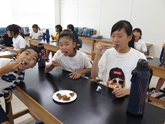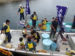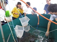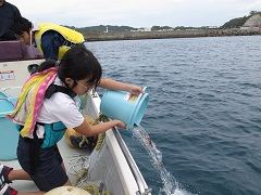 5年生は、県立大原高校との交流事業で「イサキの稚魚」の放流体験を行いました。当日は、県立大原高校の生徒が実習場で育てた「イサキ」や「ヒラメ」や「アワビ」などを見学させていただきました。大原高校の生徒からは、採卵から稚魚になるまでの話を聞き、栽培漁業について理解を深めることができました。その後、船で沖に出て、放流を行いました。子ども達は、「大きくなって戻ってね」という思いを込めて放流しました。最後に「イサキの唐揚」をご馳走になりました。には「50個は食べられる」という児童もおり、海の恵みを感じていました。