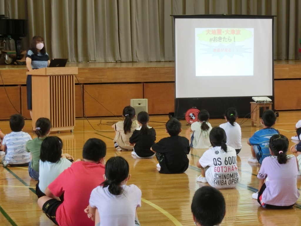 全校朝会では、校長先生から「地震・津波から命を守る」をテーマにお話がありました。