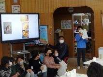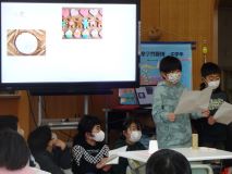 3年生は、「すがたをかえる大豆」の学習で学んだことを生かし、自分で調べた「すがたをかえる〇〇」を、パワーポイントを使って発表しました。小麦からパンやクッキー、リンゴからジャムやアップルパイ、カツオから鰹節というように、身の回りの食材が様々な食べ物に加工されていることを、わかりやすく説明しました。