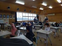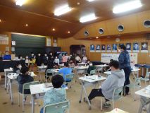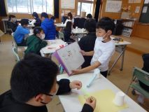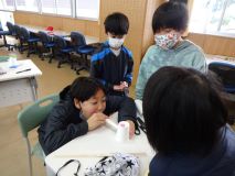 2年生は、紙コップや割り箸など身の回りにあるものでおもちゃを作り、その作り方を説明書にまとめました。説明書を見せながら、3年生や先生方に作り方を教えました。「おどるヘビ」や「ゴムロケット」などを一緒に作り動かしてみると、そのおもしろい動きに3年生は大歓声をあげました。手作りおもちゃで遊ぶの楽しさをみんなで味わいました。