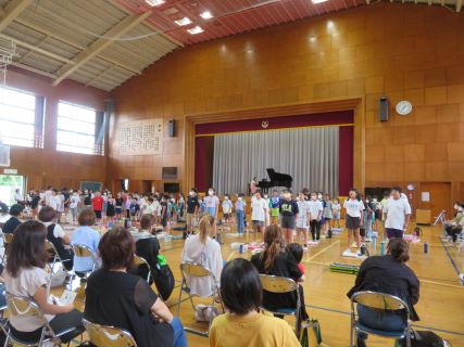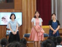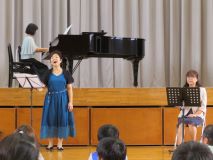 第1部では、歌と語り、ピアノによる音楽物語「ちいちゃんのかげおくり」を披露してくださいました。伸びやかで美しい歌声と、様々な情景を奏でるピアノの音色が、会場いっぱいに響き渡り、音楽のすばらしさを肌で感じることができました。全校合唱「世界が一つになるまで」では、ピアノの伴奏に合わせ、平和への願いをこめて歌声を響かせました。