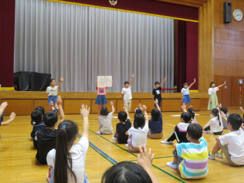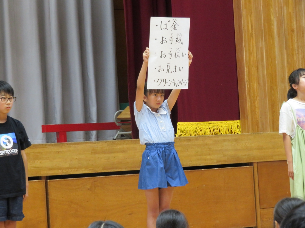 7月8日、全校朝会で運営員会が、青少年赤十字(JRC)活動について発表しました。