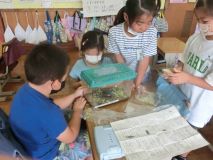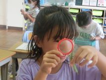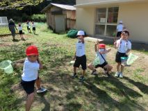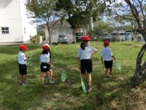 1年生が、生活科の時間に校庭で虫探しをしました。草むらで、バッタやカマキリを見つけては、網で捕まえ、虫かごに入れていました。教室にもどって、虫めがねでじっくりと観察したり、虫のすみかづくりをしたりしました。