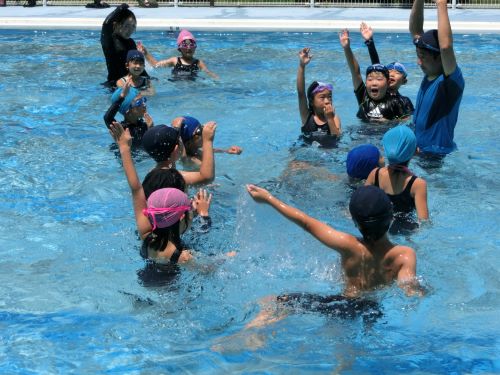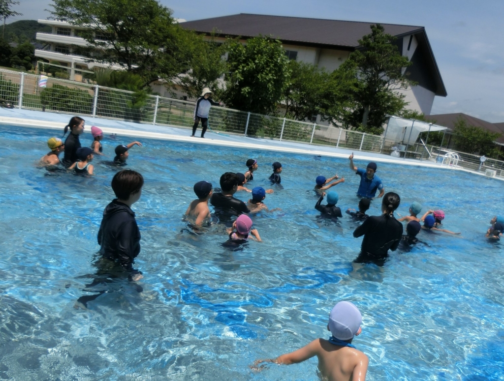 7月12日、夏本番を思わせる強い日差しの中、1.2年生が水泳の授業を行いました。今年4回目の水泳授業です。