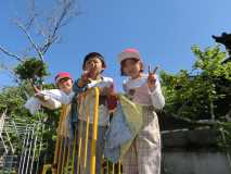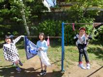 ジャングルジムにみんなで布をつなぐと、おしゃれな秘密基地のようでした。