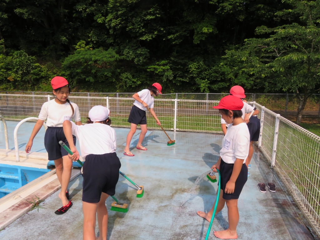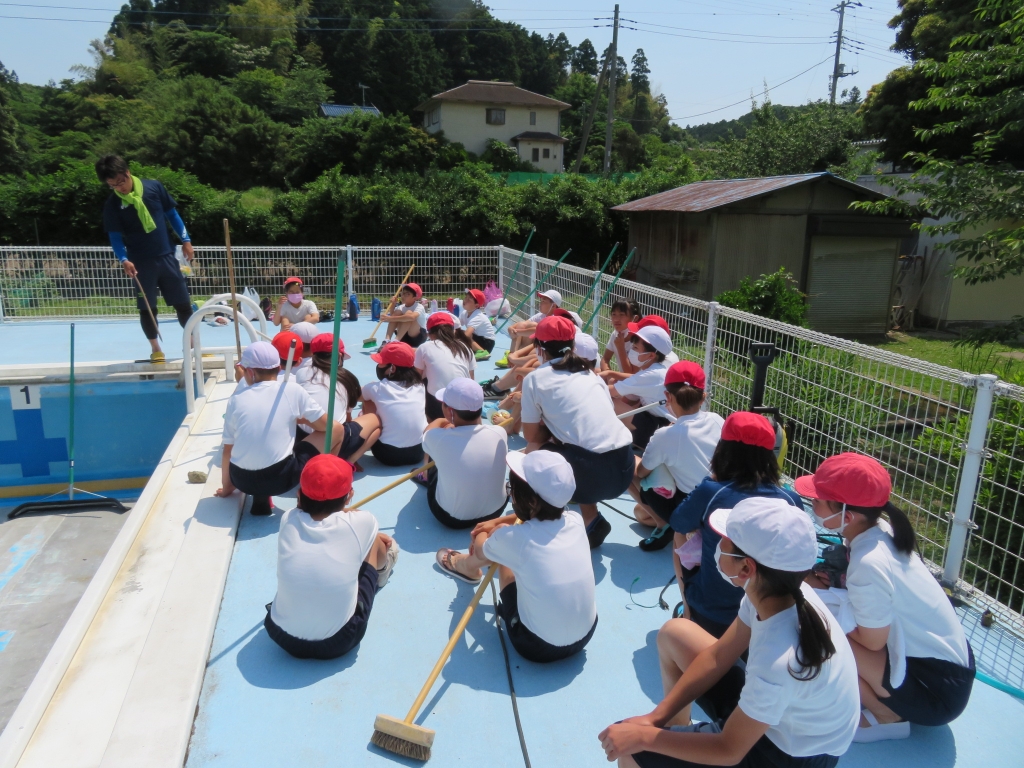 6月8日、5,6年生がプール清掃をしました。昨年は水泳の授業が中止になってしまったため、2年分の汚れを落とします。プールの内壁や床の汚れを落とす作業はとても大変でしたが、みんなで力を合わせ、きれいに掃除することができました。
