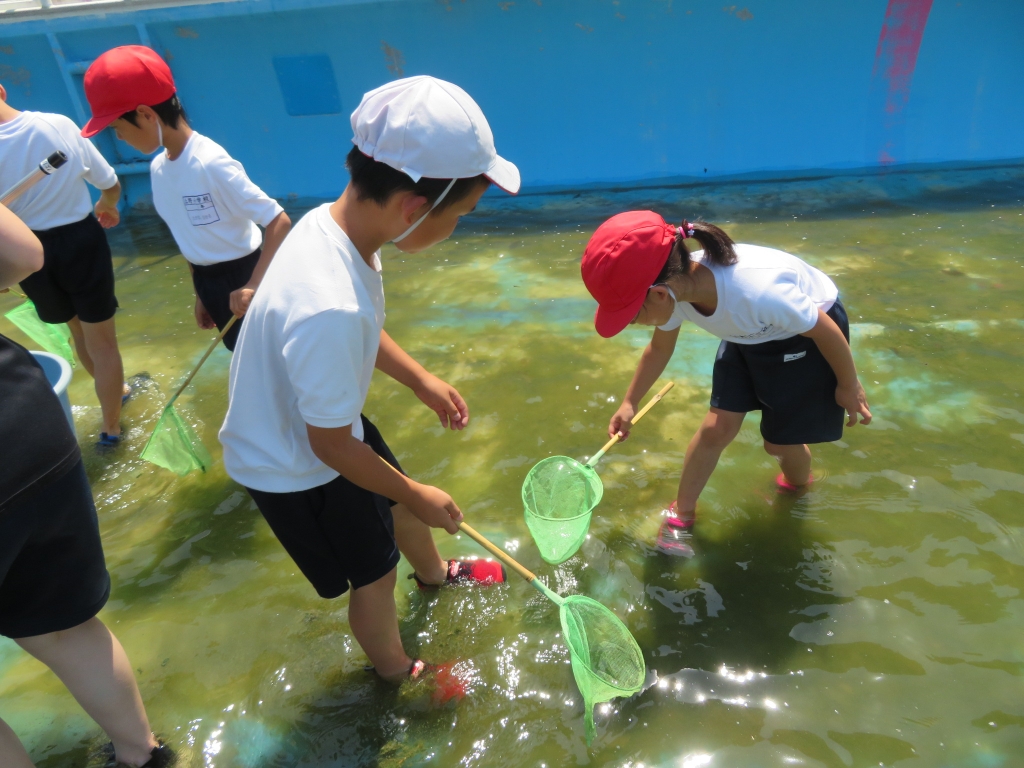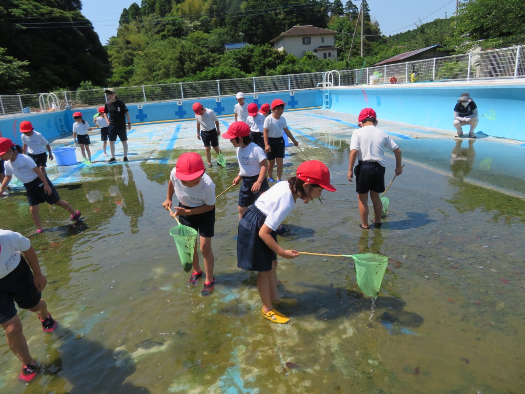 1,2年生がプール掃除の前にヤゴとりをしました。