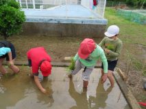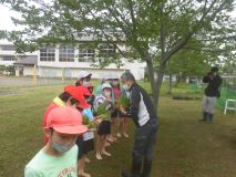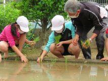 4月28日、5年生が学校のミニ田んぼで田植えをしました。今年も、米作りの先生として地域の方にご協力いただき、苗の植え方を教えていただきました。