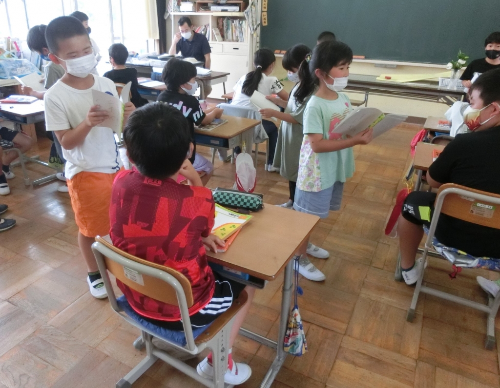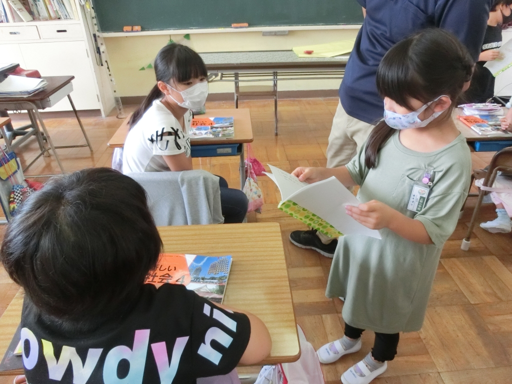 2年生が国語の学習で「○○クイズ」を作り、4年生、1年生と交流しました。