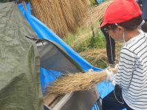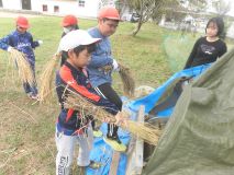 米作りに取り組む5年生が、昔ながらの脱穀機で脱穀作業を体験しました。