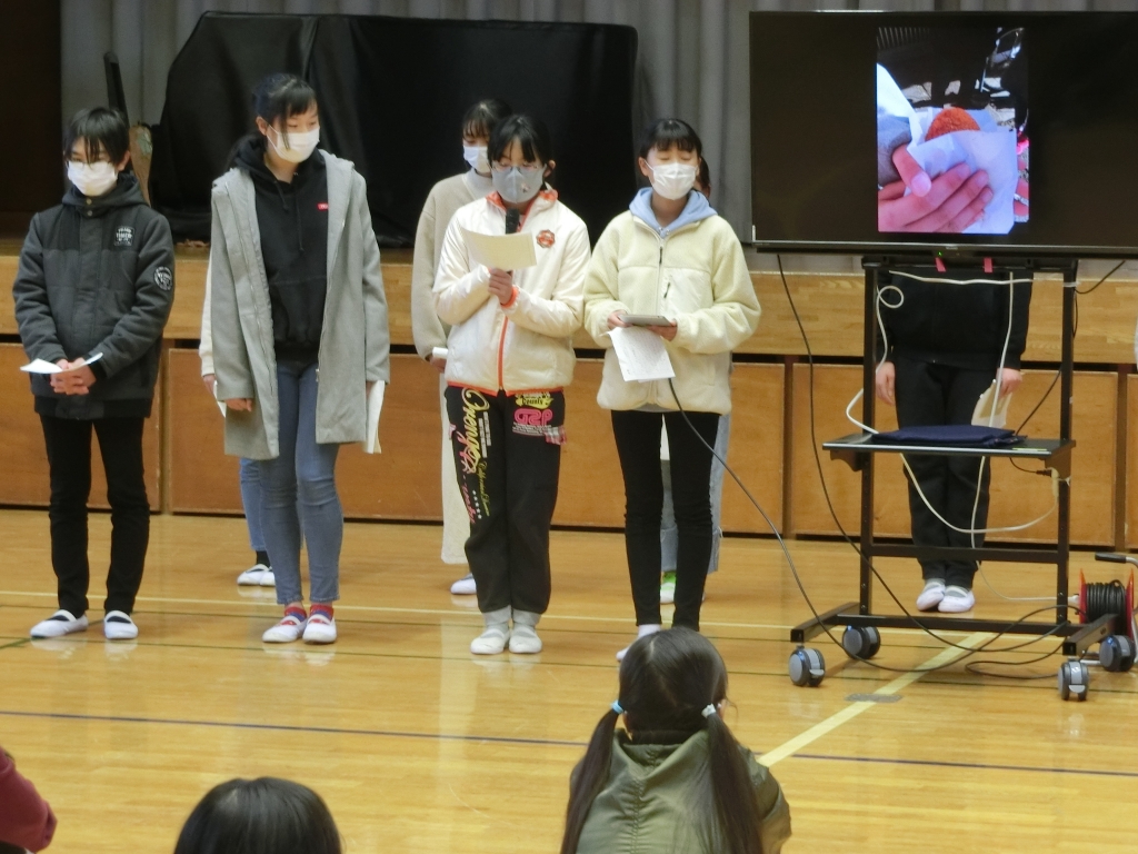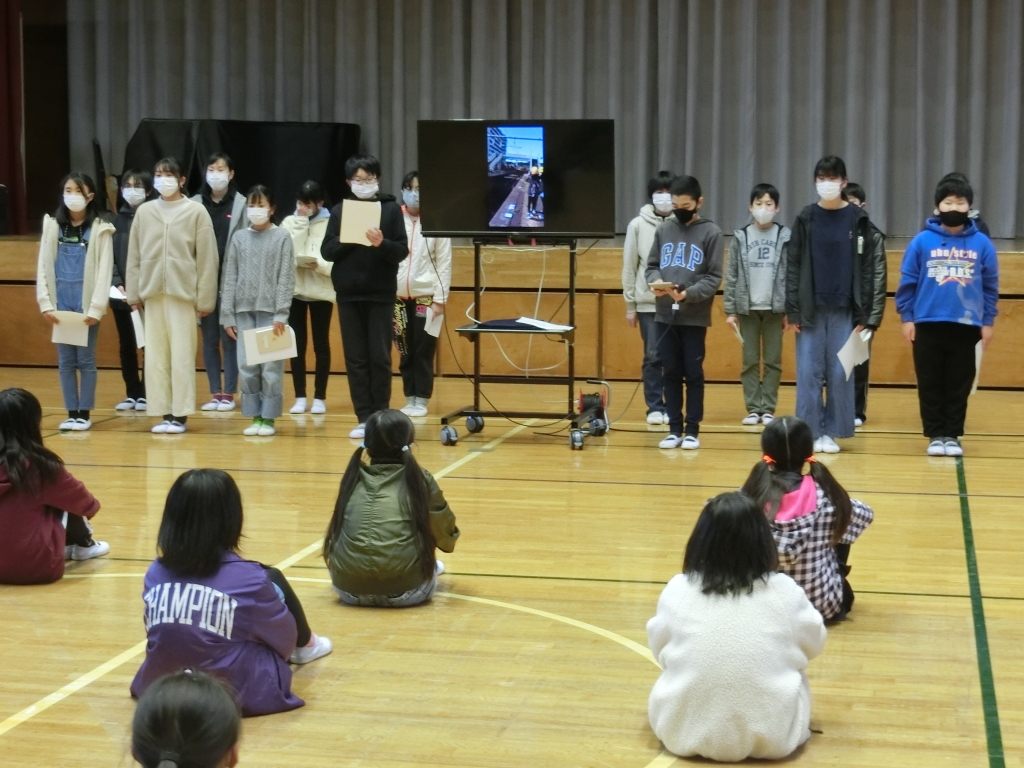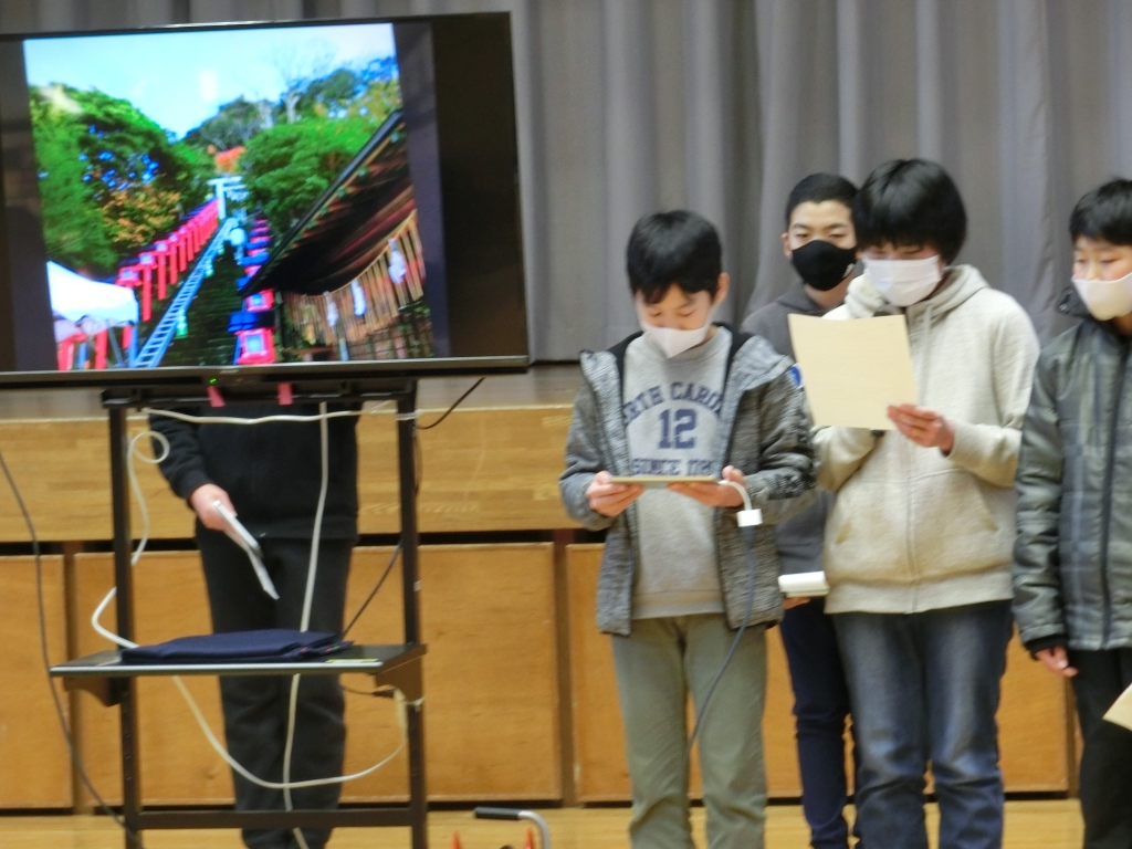 1月29日、6年生が、班別校外学習で発見した勝浦の魅力を、4,5年生に発表しました。写真や動画を班ごとに編集し、勝浦漁港や朝市、遠見岬神社などの魅力の他、こども園や図書館などの施設や、おすすめのグルメなどを紹介しました。