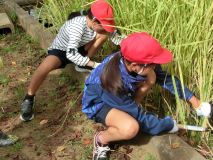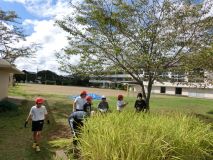 残暑の中にもさわやかな秋の風を感じる9月。上野小学校のミニ田んぼに黄金色の稲穂が実る季節ですが、今年は、お盆の間にほとんどの穂を鹿(?)に食べられてしまいました。しかし、5年生はくじけません。元気に稲刈りを行いました。はじめは、鎌の持ち方もぎこちない様子でしたが、だんだん力強く上手に刈ることができるようになりました。刈った稲を縛って干す作業も、一生懸命取り組みました。