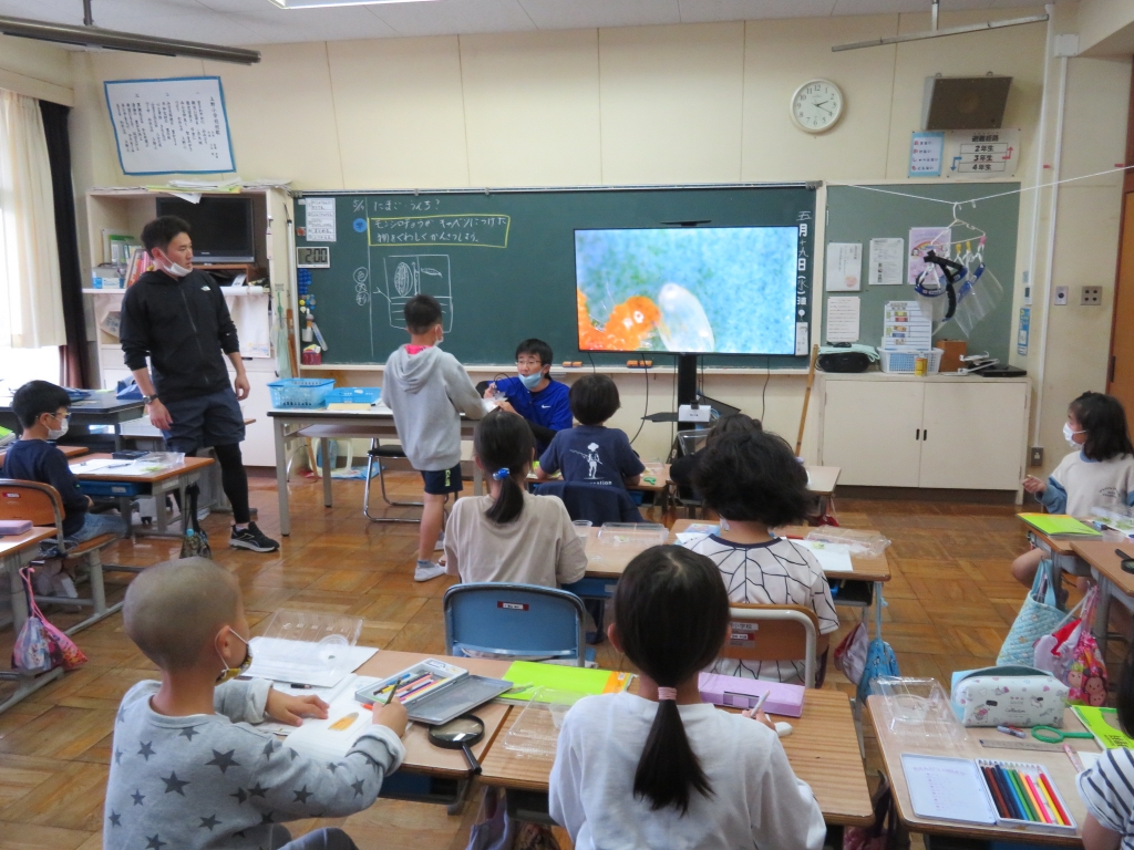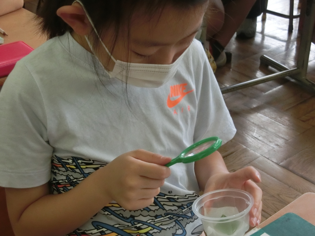 デジタル顕微鏡カメラを使って観察してみると、生まれたばかりの幼虫がはっきり見えました。一生懸命卵を食べる姿に「がんばれ」「かわいい」「おなかがすいているんだね」「たまごには栄養があるのかな」とみんなの目を丸くしていました。小さな命の誕生に感動しました。