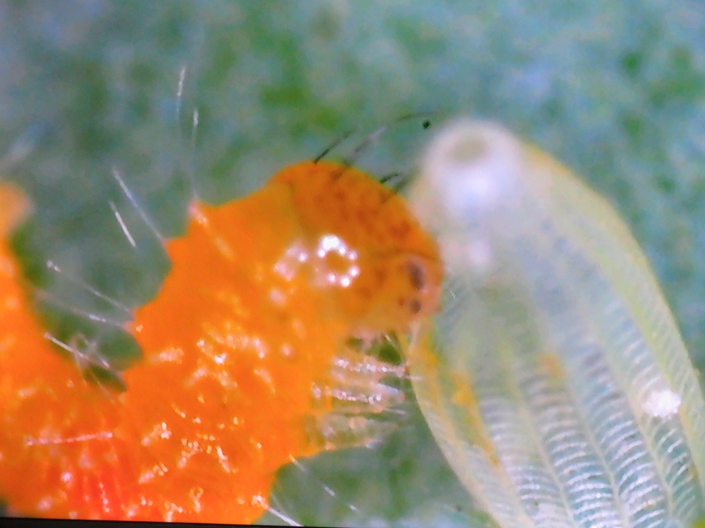 約1mmと、小さな幼虫は、虫眼鏡で見てもあまりよく見えません。