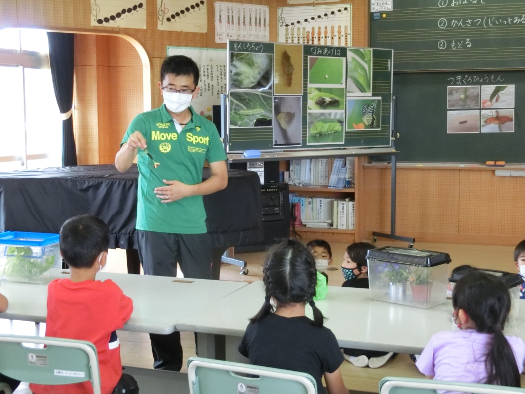 1,2年生の生活科「いきものとなかよし」の学習で、たくさんの生き物を観察しました。おたまじゃくしやザリガニ、トノサマバッタ、モンシロチョウの幼虫など観察した9種類の生き物は、どれも学校の周辺で見つけたものです。「かわいい!」「ちょっとこわい」「大人になったらさわる」と等々、子ども達は目を丸くして話していました。