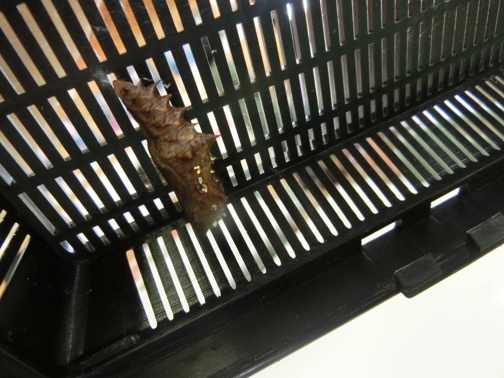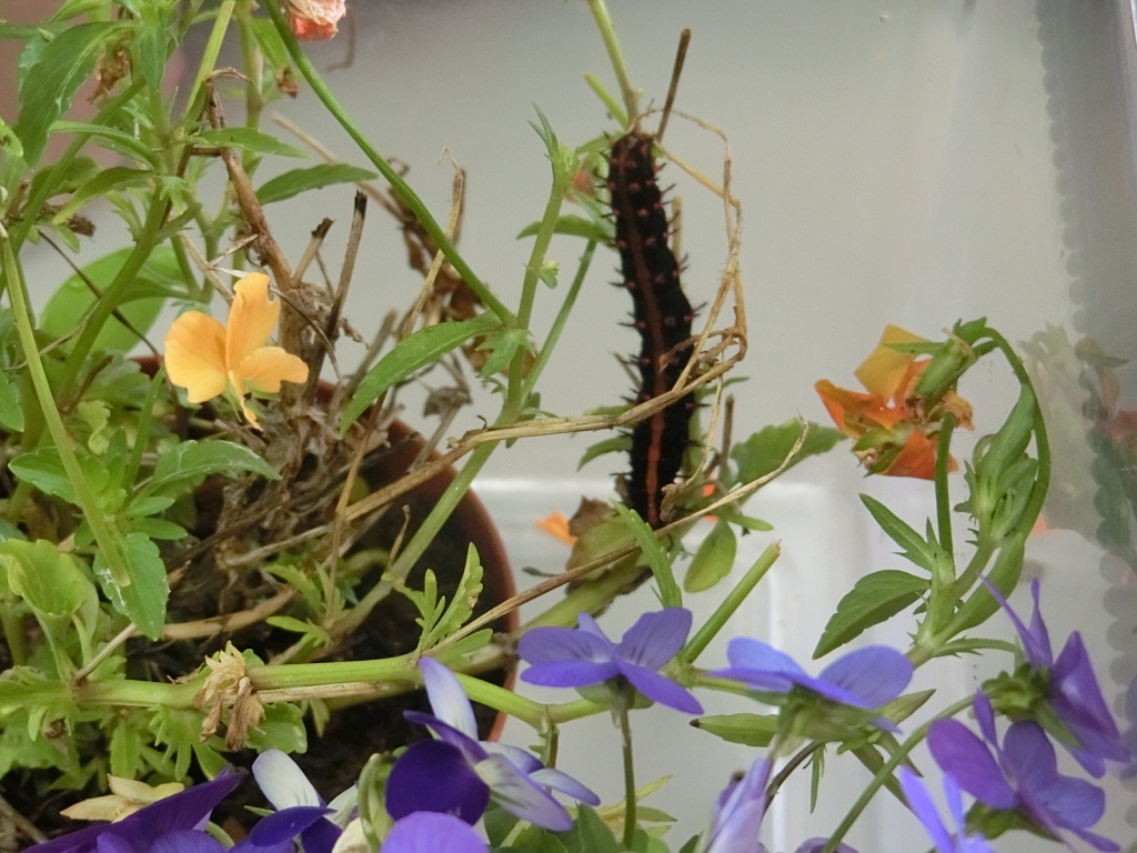 子供たちに大人気の「ツマグロヒョウモン」。幼虫は黒い体に鮮やかなオレンジ色の模様があります。さなぎは、金色に輝く点模様がありとてもきれいです。