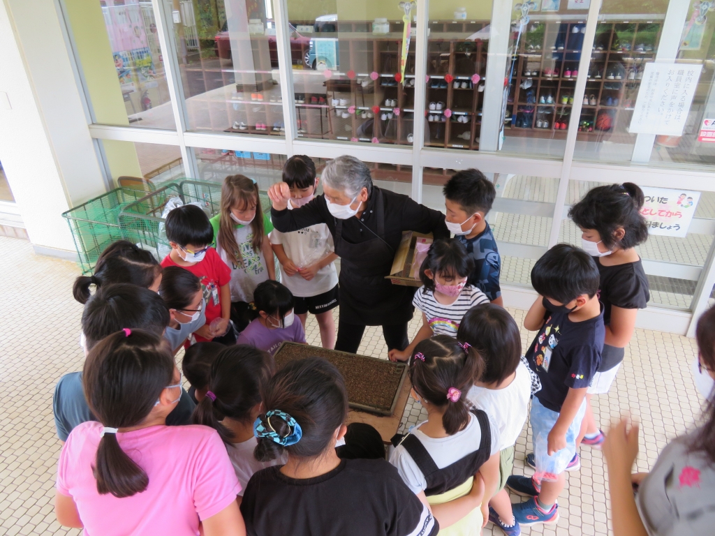 今年も農業の先生として、大森地区の松﨑さんにご協力いただき、種のまき方を教わりました。土の入れ方や種をまく時の向きに気を付けながら、一粒一粒ていねいに種をまきました。芽が出た後に畑に植えていただき、9月ごろに収穫体験をする予定です。これから、トウモロコシの成長の様子や、農業の楽しさを学んでいきます。