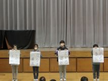 各学年で、いじめのないクラスにするためにどうしらよいか話し合い、いじめゼロスローガンを作りました。ここでは、学年の代表が、大きな声でスローガンを発表し、みんなでいじめのない学校を作っていくことを確認しました。「いじめゼロ宣言」では、いじめをなくすための4つの勇気「やめる勇気」「とめる勇気」「はなす勇気」「みとめる勇気」をもつことを宣言しました。
