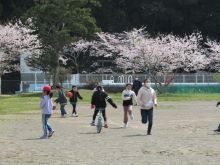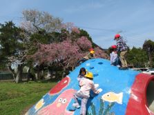 桜の花に見守られながら、元気いっぱい外遊びを楽しんでいます。