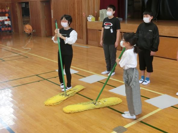 「花壇の花を大切にしよう」「口を結んで掃除に取り組もう」など、体育館から寸劇を交えながら呼びかけました。