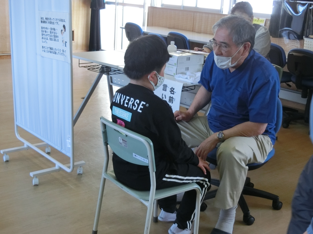 学校医の川俣先生は、「ゲームやスマホを見すぎてはいませんか?」「目をこすってはいませんか?」などと質問しながら、目に病気がないか診てくださいました。