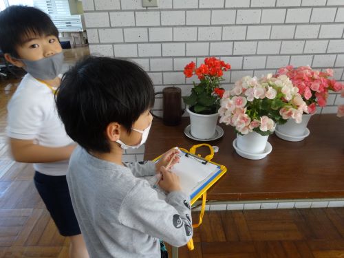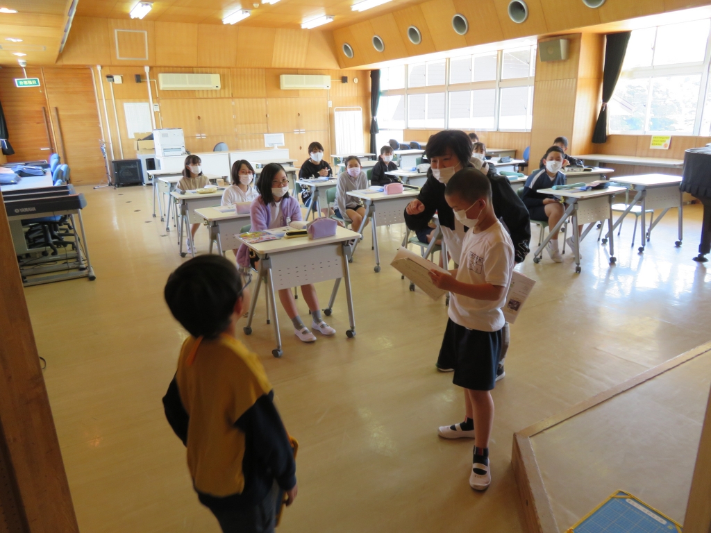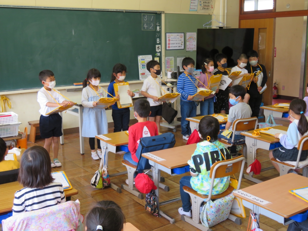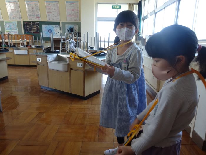 1年生にわかりやすいよう、各場所に案内カードを作って掲示したり、見つけたものにシールを貼れるようワークシートを用意したり、この日のために準備をしてきた2年生。学校探検では、やさしく1年生を案内し、それぞれの場所について上手に説明することができました。1年生も、一生懸命説明を聞いたり、質問したりしながら、学校探検を楽しむことができました。