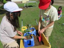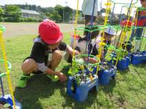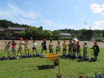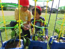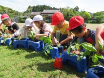 2年生が、生活科の時間に野菜の苗を植えました。自分の鉢に土を入れ、ミニトマトやナスなど、好きな野菜の苗を植えると、たっぷりとお水をあげました。おいしい野菜ができるよう、これから一生懸命世話をしていきます。