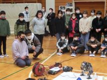 2月8日、市内の小学6年生を対象にしたロボット教室が、勝浦小学校を会場に開催されました。千葉工業大学未来ロボット技術研究センターの先川原先生から「ロボットと暮らす未来社会」をテーマにお話をしていただき、ロボットの進化や最先端の技術などを学ぶことができました。学生のみなさんに教えてもらながら実際にロボットを操作する体験では、ロボットの滑らかな動きや様々な動作、自力で立ち上がる様子に驚きの声が上がりました。子供たちは、ロボットと暮らす未来を想像し、わくわくしている様子でした。