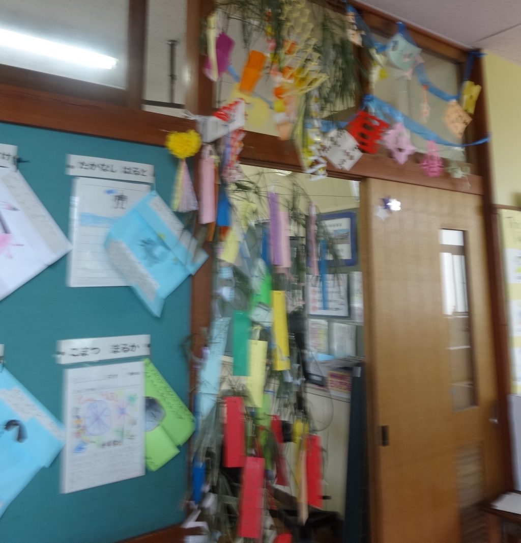 1、2年生の教室の前の、七夕飾りにたくさんの願い事が飾られました。