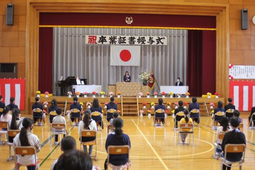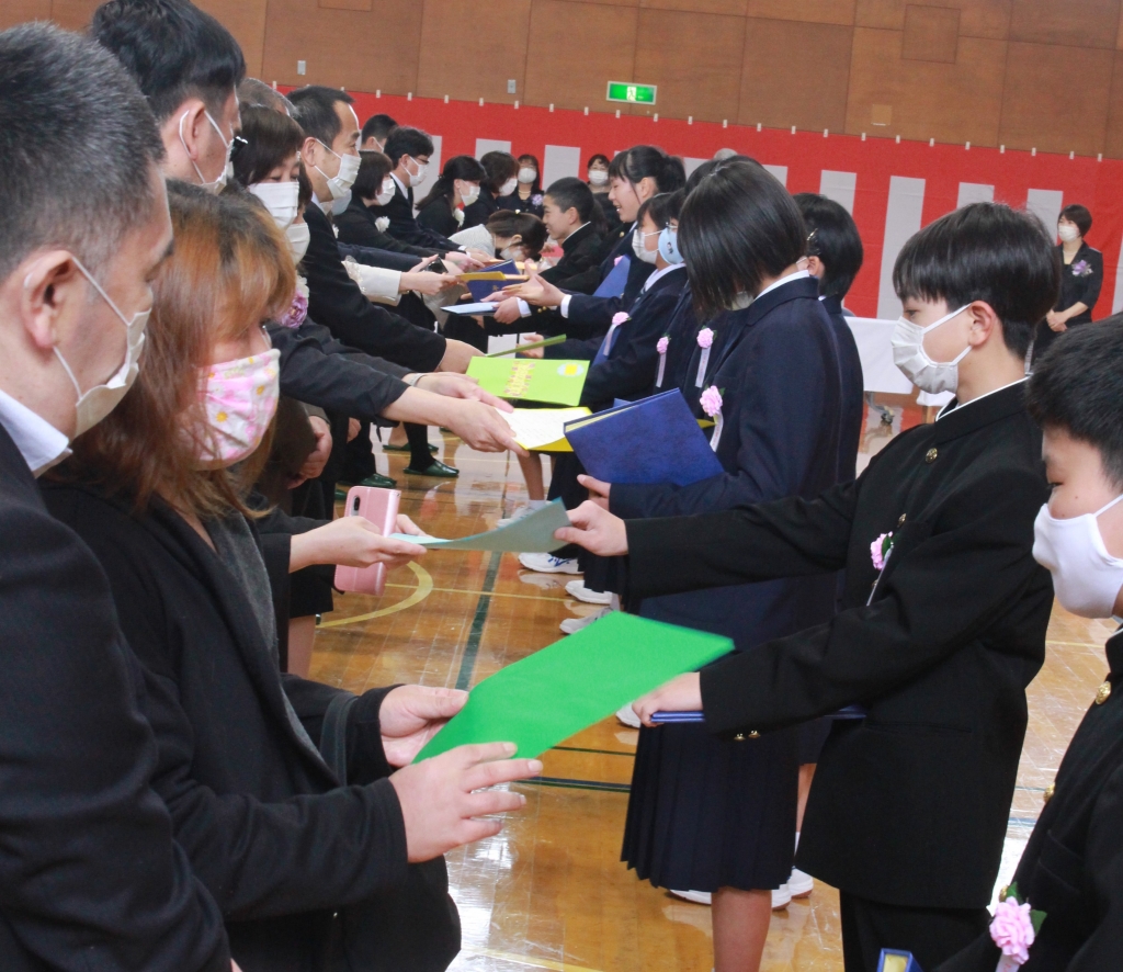 卒業生からは、コロナ禍で様々な行事が中止、縮小される中で、自分たちのために様々な工夫をしてくれた、在校生や先生方、保護者への感謝の思いが伝えられ、楽しい思い出がいっぱいの1年になったと、小学校生活を振り返りました。そして、このような1年だからこそ、多くのことを学ぶことができたと伝えられました。