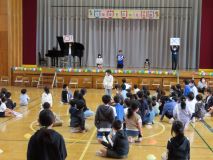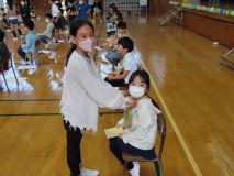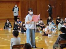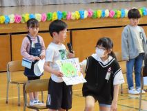 はじめに、2年生から、アサガオの種が、3年生からはメダルがプレゼントされました。1年生は、みんなで「さんぽ」のダンスを披露し、ひとりずつ立派に自己紹介をすることができました。「歓迎のことば」では、6年生の代表が「もう学校にはなれましたか?休み時間には、一緒に遊びましょう」と呼びかけました。