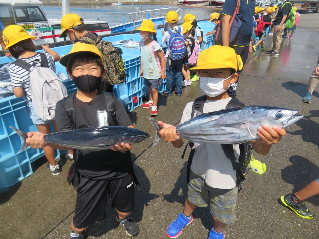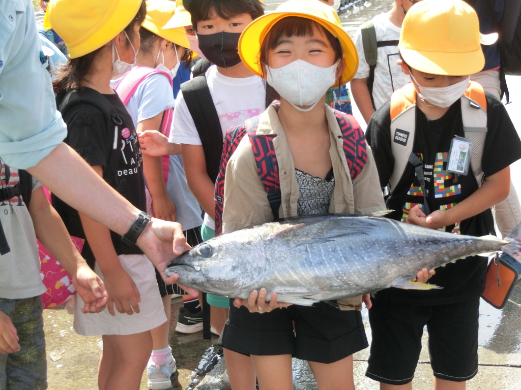 はじめに訪れたのは、勝浦漁港です。子供達を出迎えてくれたのは、水揚げされたばかりのかつお。その迫力に大歓声が上がりました。
