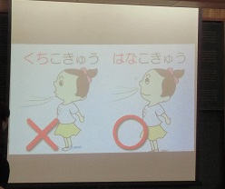 息育指導」を受けました。私たちの呼吸には、「口呼吸」と「鼻呼吸」があることを教わります。「鼻呼吸」は、空気中のチリを取り除いてくれたり、空気を温めて体内に取り入れたりするなどの働きがあります。また、脳の温度を下げ、集中力を持続させる働きがあります。一方、「口呼吸」は、ウイルスなどを直接体内に取り入れてしまったり、体内の水分をはき出してしまいドライマウスにしてしまったりしてしまいます。