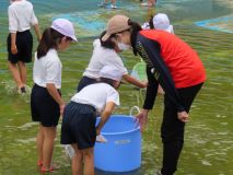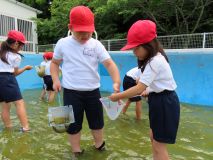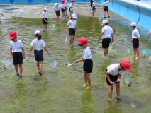 1.2年生が、水を抜いたプールでヤゴとりをしました。
