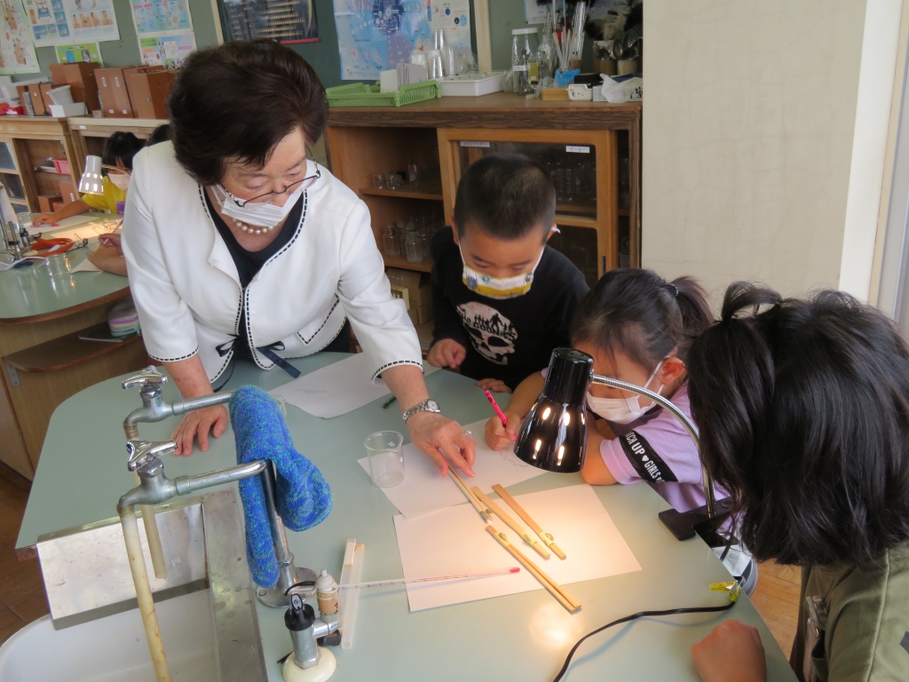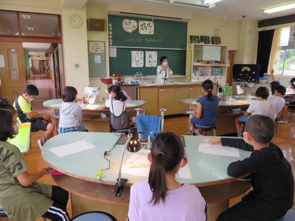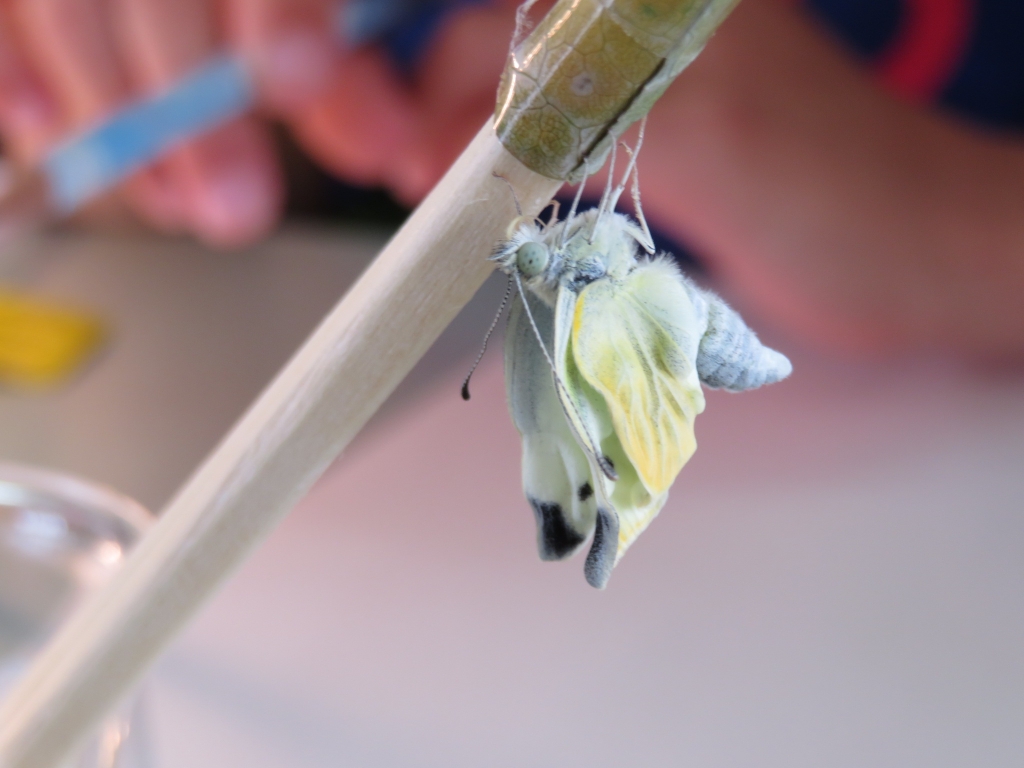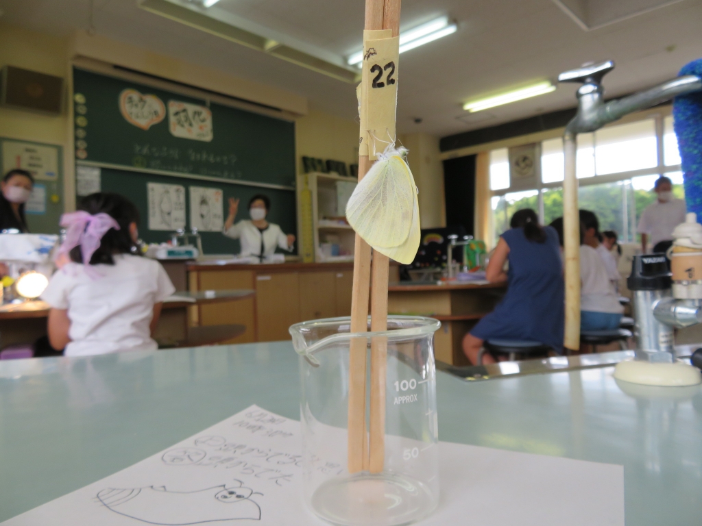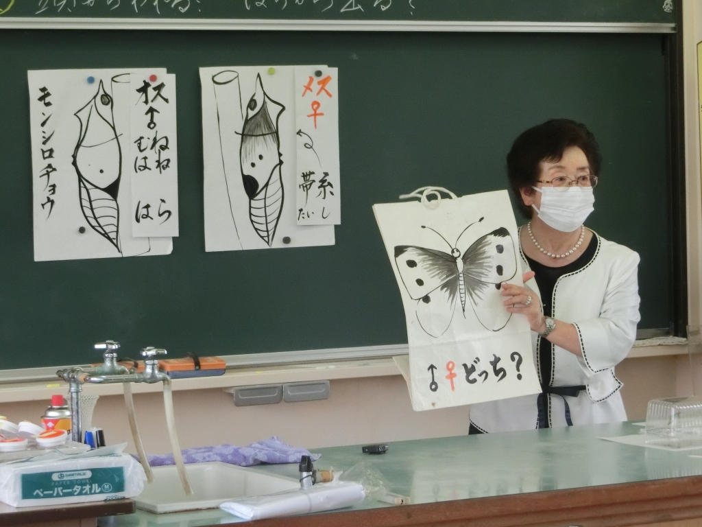 一人ずつモンシロチョウのさなぎを観察しながら、チョウの体のつくりやオスとメスの見分け方などを教えていただきました。やがて、小さなさなぎがピクリと動き、いよいよ羽化が始まりました。さなぎの背が割れ、小さなモンシロチョウの頭が見えてくると、子供たちから「がんばれ!がんばれ!」と声援が・・・体がさなぎから抜けきると大きな拍手が沸き起こりました。