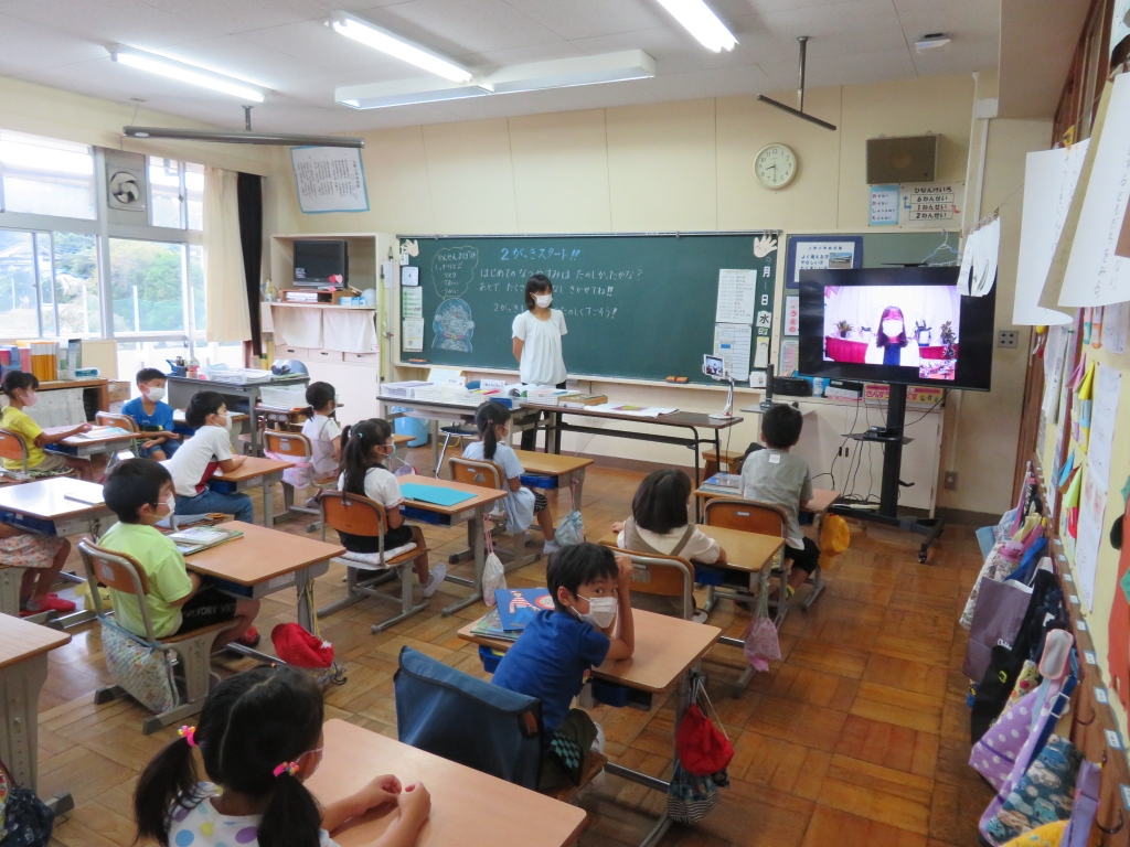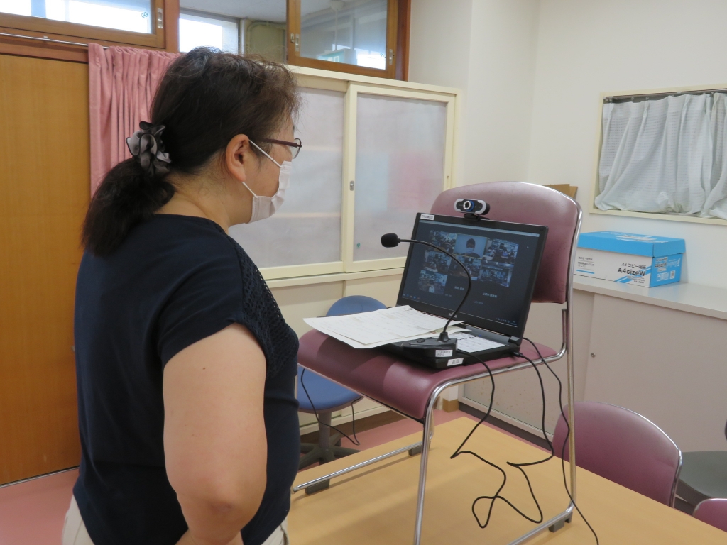 始業式はオンラインで行いました。 校長先生のお話は、校長室から。