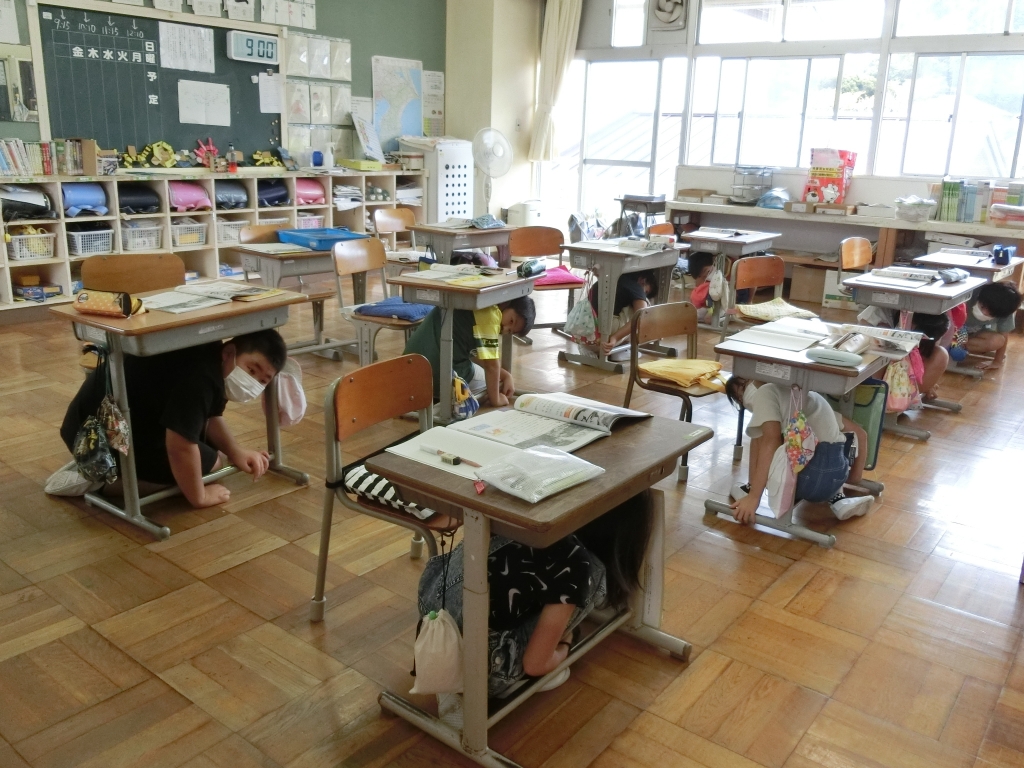 地震発生の放送を聞き、素早く机の下で避難体制をとります。