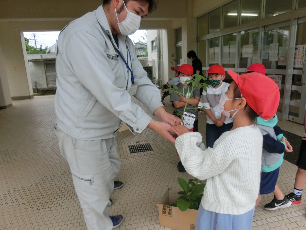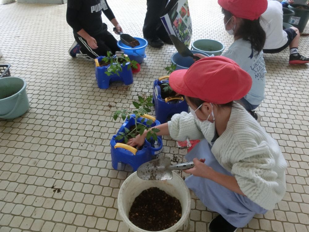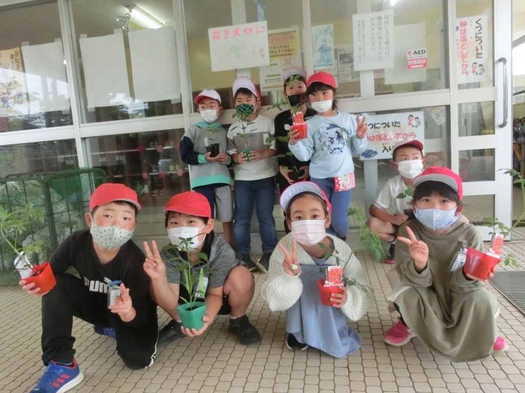 2年生は育てたい野菜を決めて、苗を買いました。JAの職員の方が苗を届けてくださり、一人一人代金を払って苗を受け取りました。ミニトマト、なす、ピーマン、きゅうりの苗を手にして、みんな嬉しそうです。