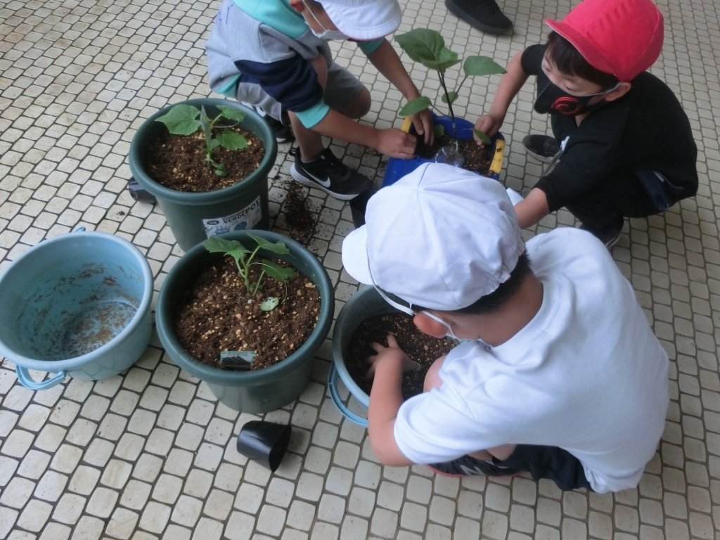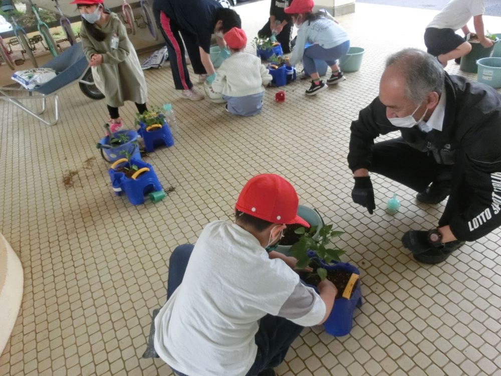 苗の植え方は、清水教頭先生が教えてくれました。土をふわふわに耕し、やさしくていねいに苗を植えました。