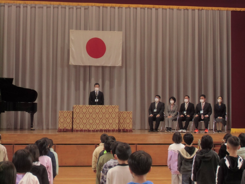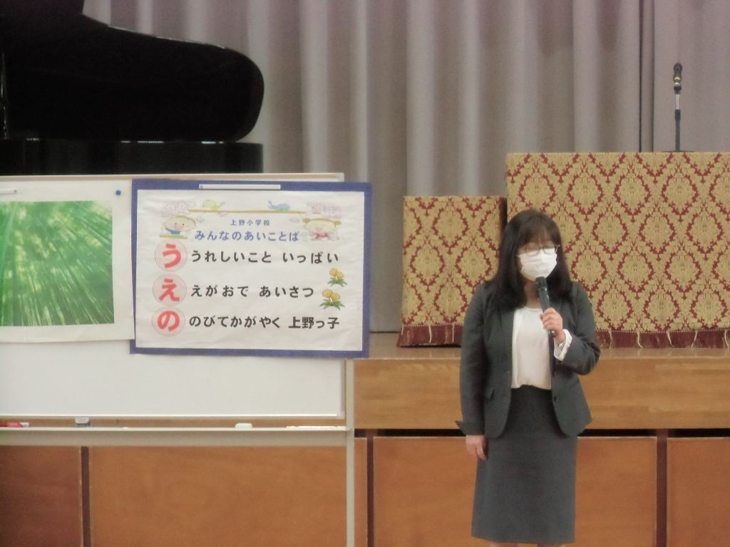 始業式では、校長先生から「自分の目標をもち、1年間がんばりましょう。」「『上野小のあいことば』を大切に、みんなで楽しい上野小学校をつくっていきましょう。」とお話がありました。