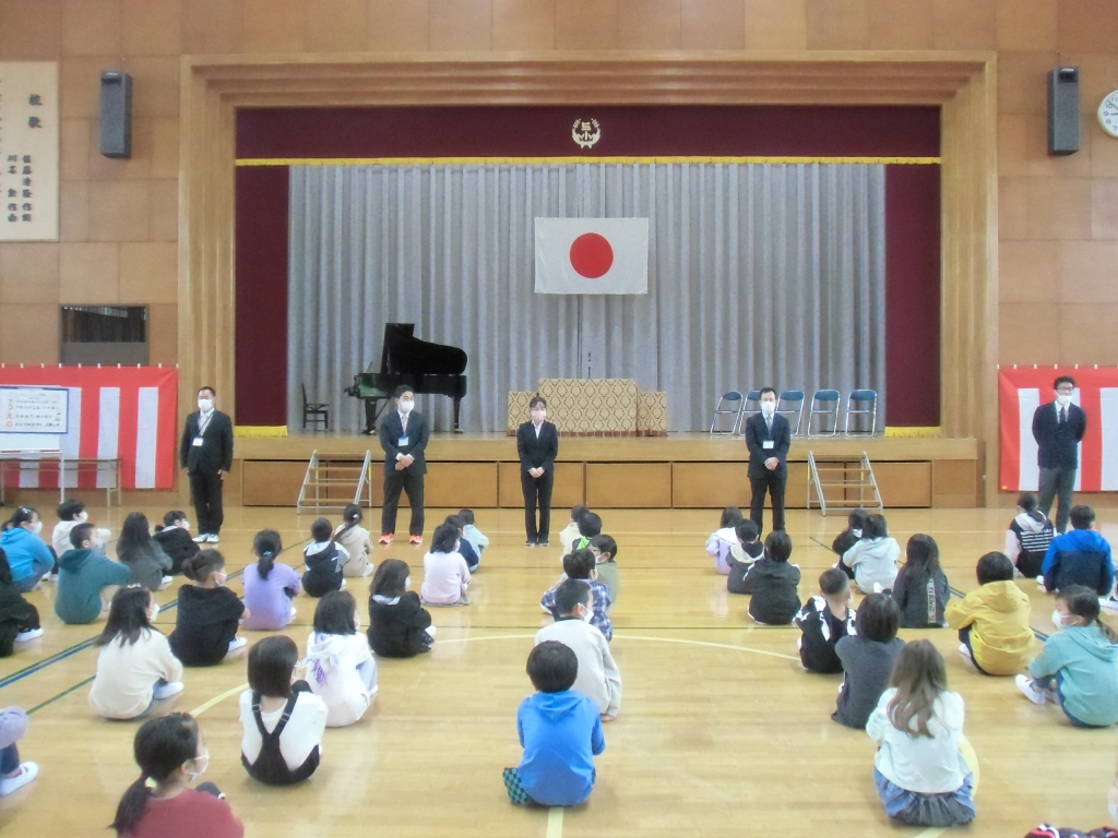 着任式が行われ、新しく上野小に着任した5名の先生方が紹介されました。