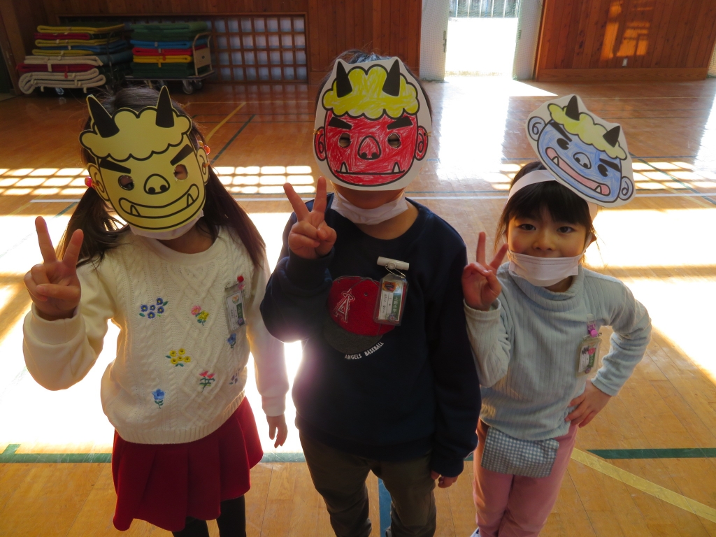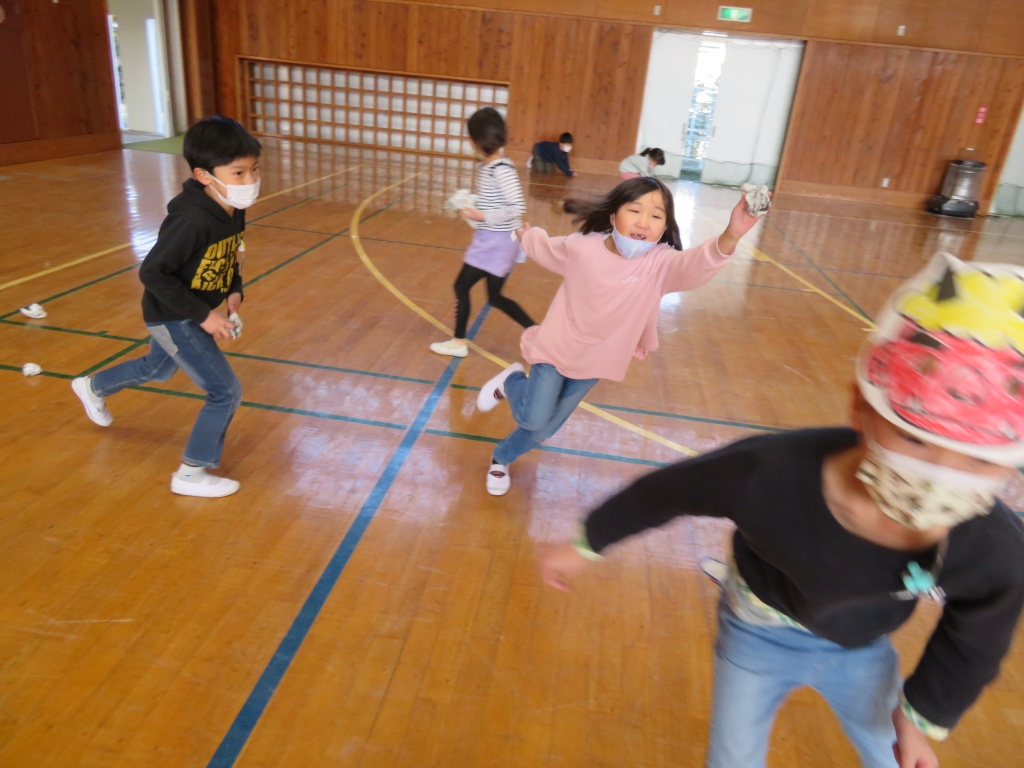 「あきらめおに」「ゲームやりすぎおに」など、たくさんの鬼の名前を書くと、その紙を丸めて、鬼めがけて投げました。「鬼は外!」「福は内!」と元気な声が体育館に響きました。たくさんの福がみんなのところにやってきますように。