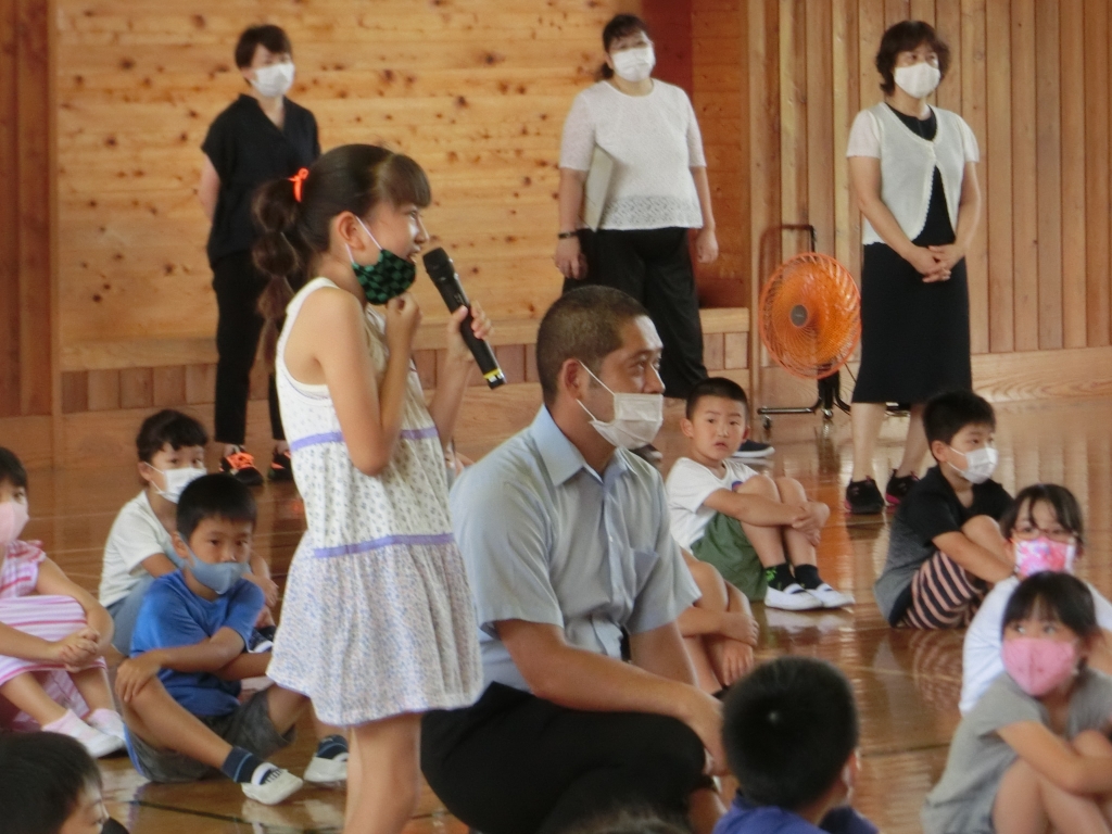 「1学期にうれしかったことはなんですか。」という校長先生の質問に、「学校が再開してみんなに会えてうれしかった。」「勉強が進んでうれしかった。」などと答えてくれました。