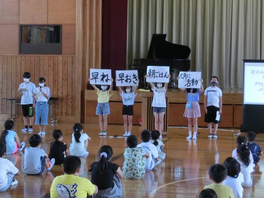 夏休みを元気に過ごすために、睡眠、食事、運動に気を付け、「生活のリズム」を整えようと呼びかけました。