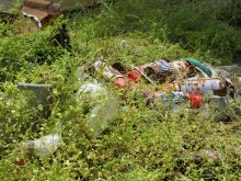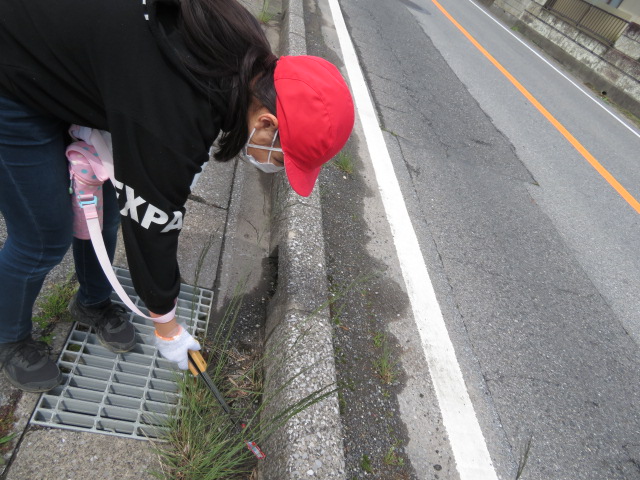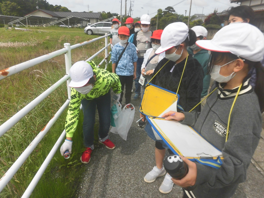 5月10日、5年生が、総合の学習で地域のごみ調べを行いました。学校を出発して向かったのは、いつもスクールバスで通っている県道です。きれいに見える道路も実際に歩いてみると、缶やお菓子の袋、たばこの吸い殻など、思った以上にゴミがあることがわかり、みんな驚いていました。次に、比較的細い道路を調べました。川の周辺には、ごみ捨て禁止の看板があり、このような場所でポイ捨てが見られることがわかりました。拾ったごみは種類ごとに分類し、量を記録しておきます。