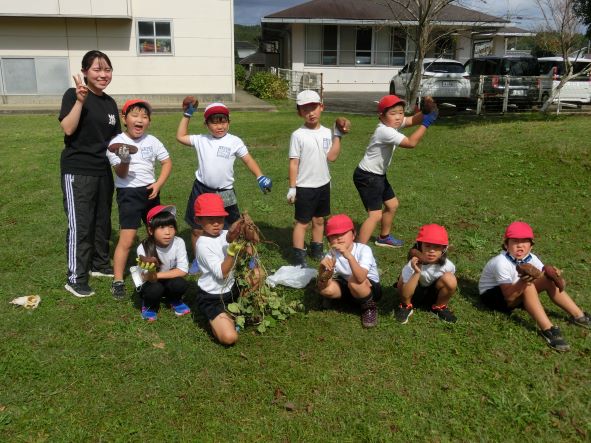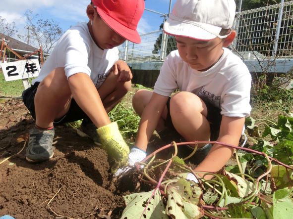 1.2年生が、校庭で育てたサツマイモが大きく育ち、みんなで芋ほりをしました。