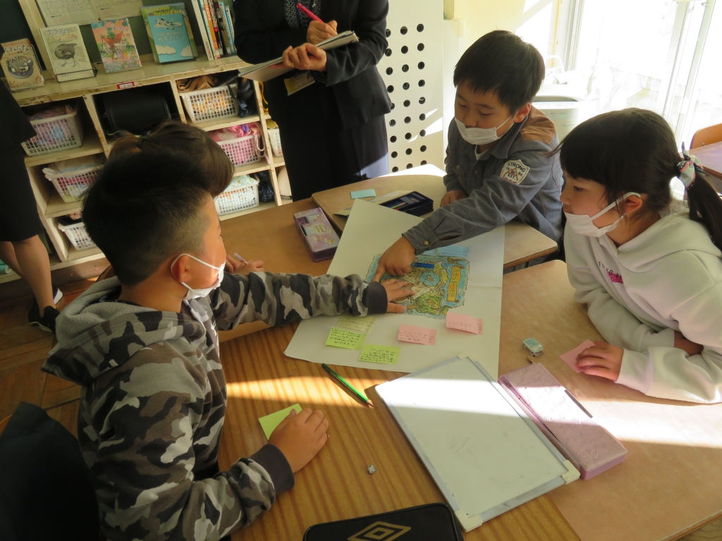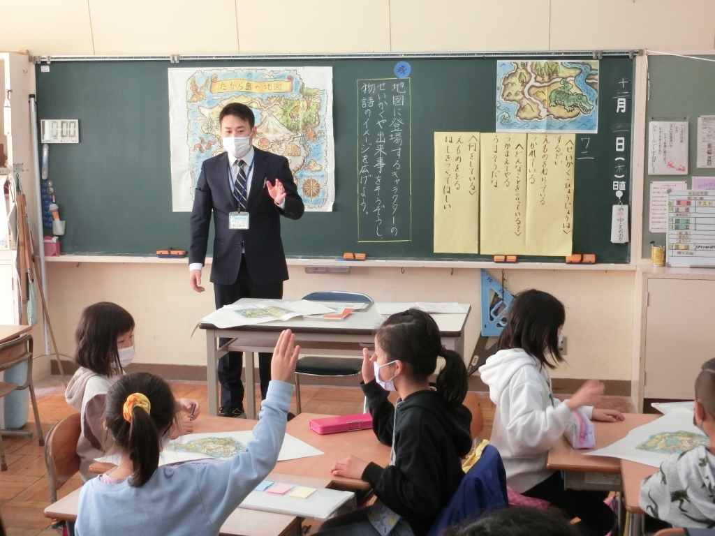 はじめに、先生の見本を見たときには、「難しそう」「できるかなあ」と不安そうな子もいましたが、みんなでアドバイスし合いながら楽しく学習に取り組みました。宝島の地図をもとに、登場人物のキャラクター設定や宝までのルート、出来事などを考えるうちに、お話の世界がどんどん広がっていきました。