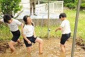 4月27日(月)、登校時は傘を差しても服が濡れてしまうほどの大雨でしたが、昼頃からは一転して晴れ間が広がり、昼休みには、水たまりの残るグラウンドで、子供たちは元気いっぱい走り回っていました。